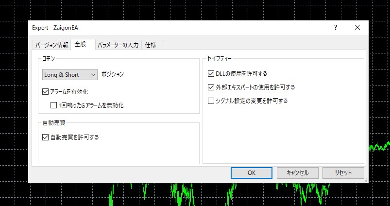 ⑧ZaigonEAをチャートへ設置後、以下のようなポップアップが出現するため、「DLLの使用を許可する」と「自動売買を許可する」へチェック。(その他はデフォルトのままで大丈夫です。)