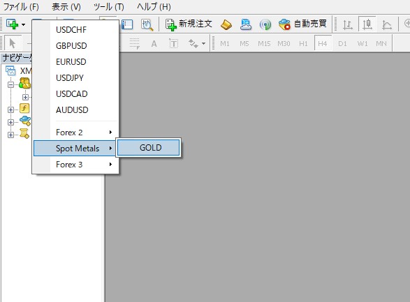 ⑥Expertsへ設置後、MT4を更新or再起動後、「ファイル」→「新規チャート」→「GOLD」を選択。