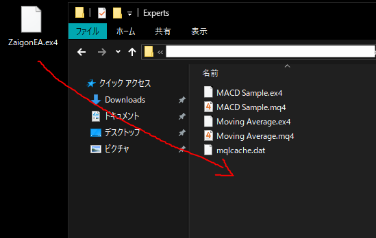 ⑤一番最初にダウンロードしたZaigonEA.ex4をそのまま「Experts」の中へ設置。