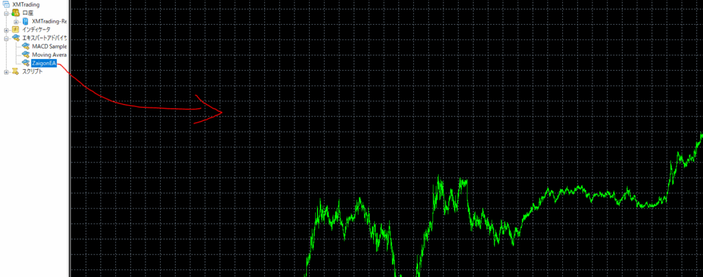 ⑦GOLD1分足へZaigonEAをチャートへ設置。
